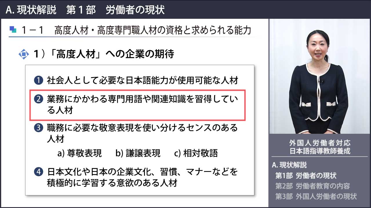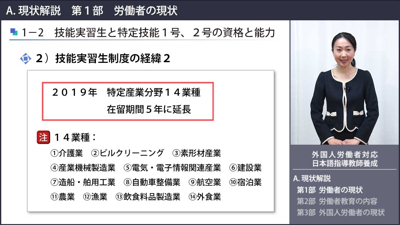 こちらのコース内では、これまで「日本語教師実力養成コース」、「日本語ビジネス教師養成講座」、「技能実習生日本語教育 教師養成コース」が視聴可能となっておりました。今回、新たに「外国人労働者対応 日本語指導教師養成コース」が加わります。