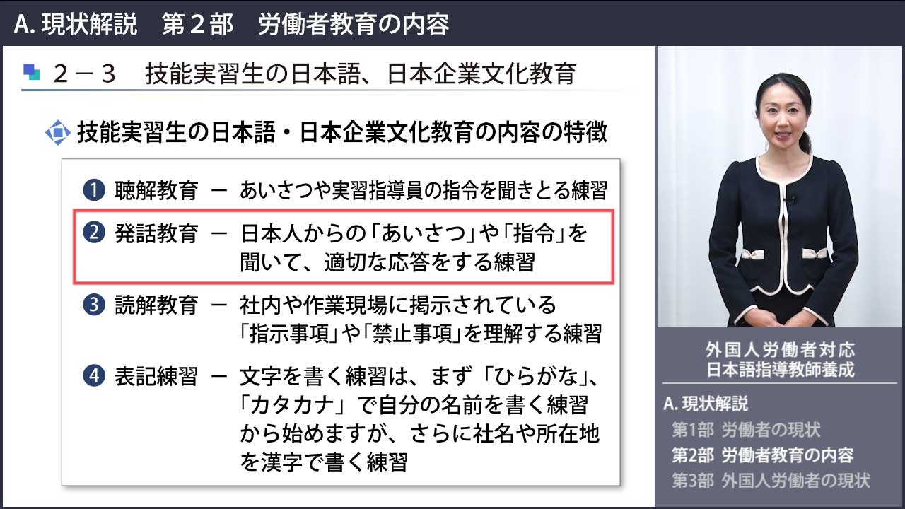 本教材はeラーニング動画教材です。内容としては、日本語教師が外国人労働者の置かれている状況や問題点を理解した上で、高度人材へのビジネス日本語と日本企業独特の文化教育について外国人労務者を指導します。また、本教材において教師に必要な理論と労務者教育の日本語教育の特殊性について、日本企業で業務を遂行するのに必要なコミュニケーション能力育成のための実践的な文法と用法知識も含まれています。技能別の実践的な指導技術とする発音・発話指導、聴解指導、読解指導、表記・作文能力指導の最新の内容を解説しております。