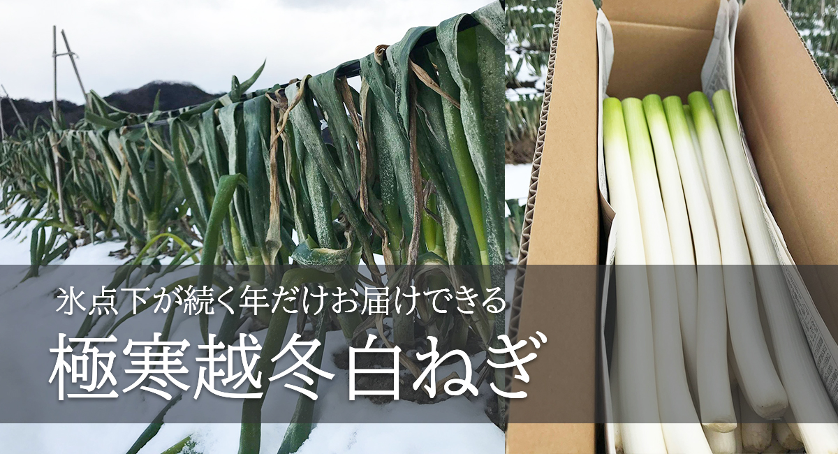 「極寒越冬白ねぎ」とは、雪の下で最強寒波(マイナス9度以下)の強い寒さに耐え、甘さのピークを迎えた白ねぎ(長ネギ)のことをいいます。