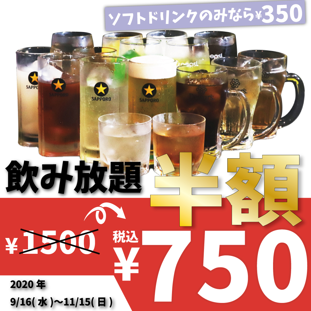 2時間飲み放題半額750円キャンペーン