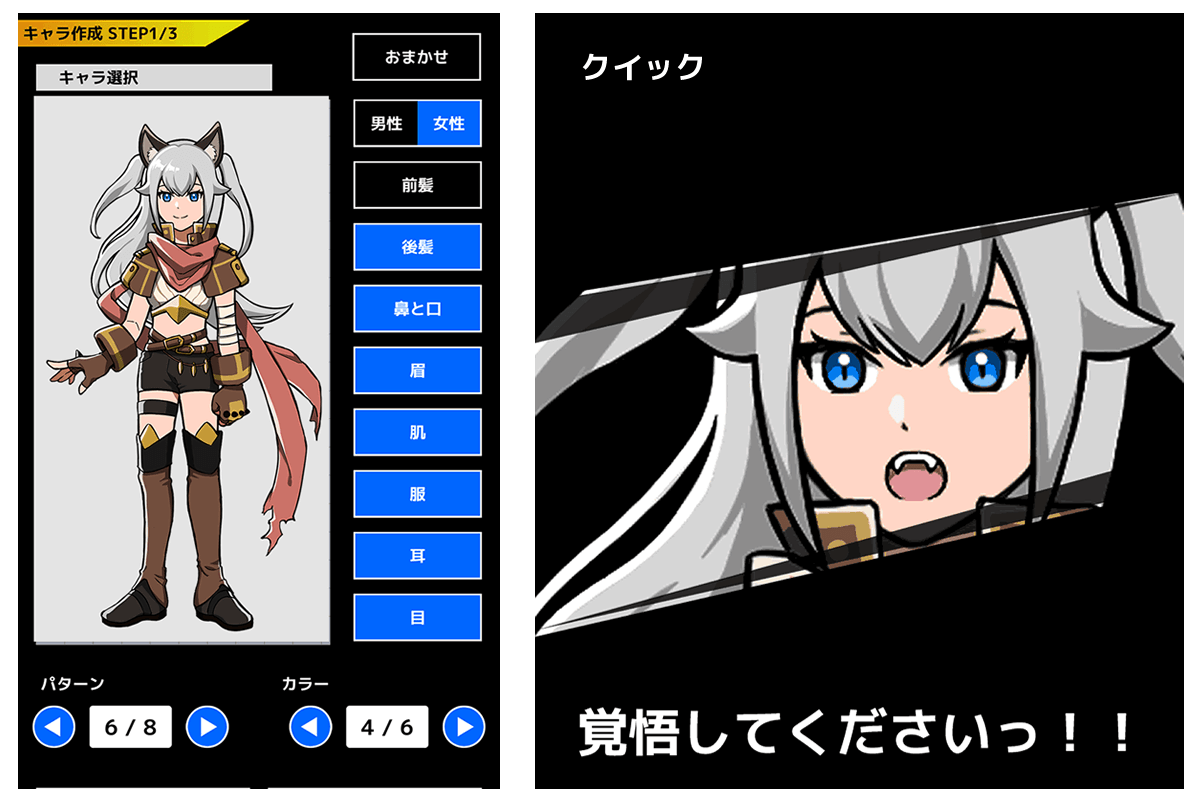 容姿だけでなく、プロフィール、ステータス、カットイン、決めセリフまで、設定できます。創作的なキャラメイクが可能であり、プレイヤーはよりこだわったキャラを作成できます。