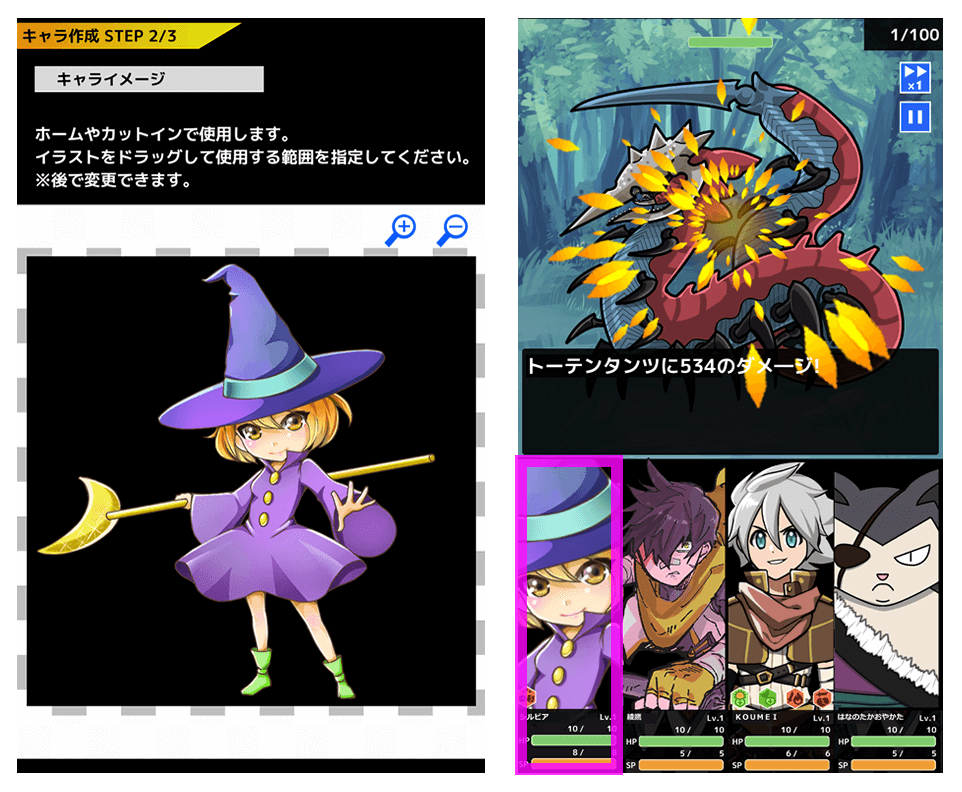 自分で描いた絵を設定することもでき、ゲーム内で躍動します。カットインや決めセリフも加えて設定できます。バトル内でのカットインを設定して、オリジナルの見せ場を作ったりしゃべらせるような楽しみ方は格別です。