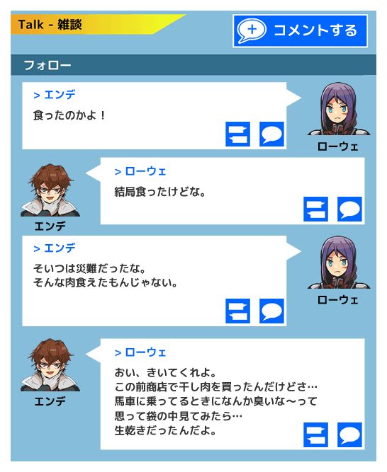 キャラクターアイコンでのチャットができます。雑談や情報交換、なりきりチャットなど使い方は自由です。様々なキャラクターが好き勝手に話している空間です。気軽にキャラクターのおしゃべりをお楽しみください。