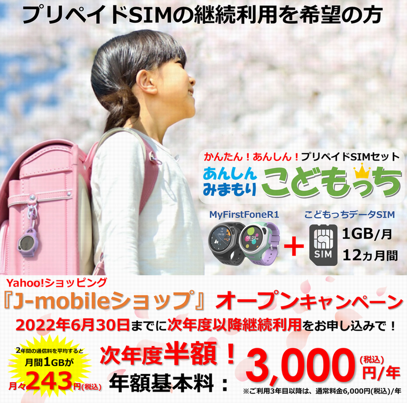 『こどもっちデータSIM』月間1GBが契約事務手数料0円!年間2,820円(税込)『J-mobileショップ』オープンキャンペーン開始!
