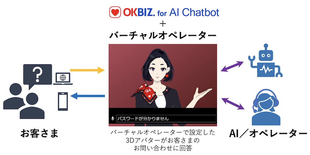 このたびの取り組みは、当社が開発するAI「KONAN」(※1)を搭載したAIチャットソリューション『OKBIZ. for AI Chatbot』(※2)をモビルスの「バーチャルオペレーター」(※3)と連携させ、AIによる自動応答とオペレーターの操作による有人対応のハイブリッドな3Dアバター応対による新たな顧客サポート体験を提供します。