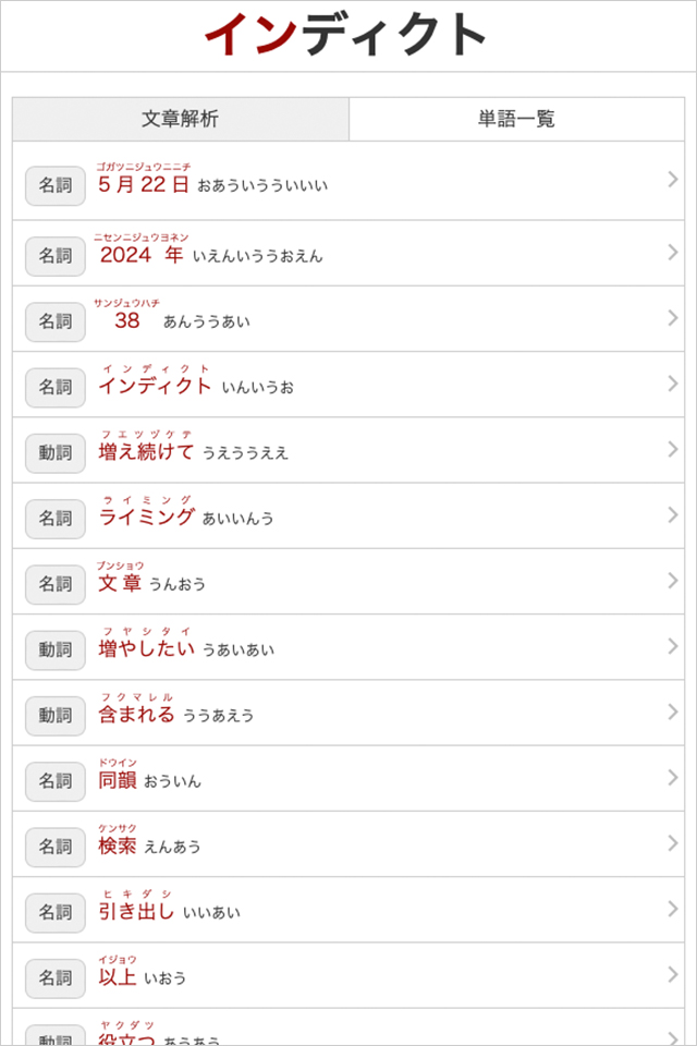 解析結果は、元となる文章から単語を抽出し、それぞれの韻を表示します。
