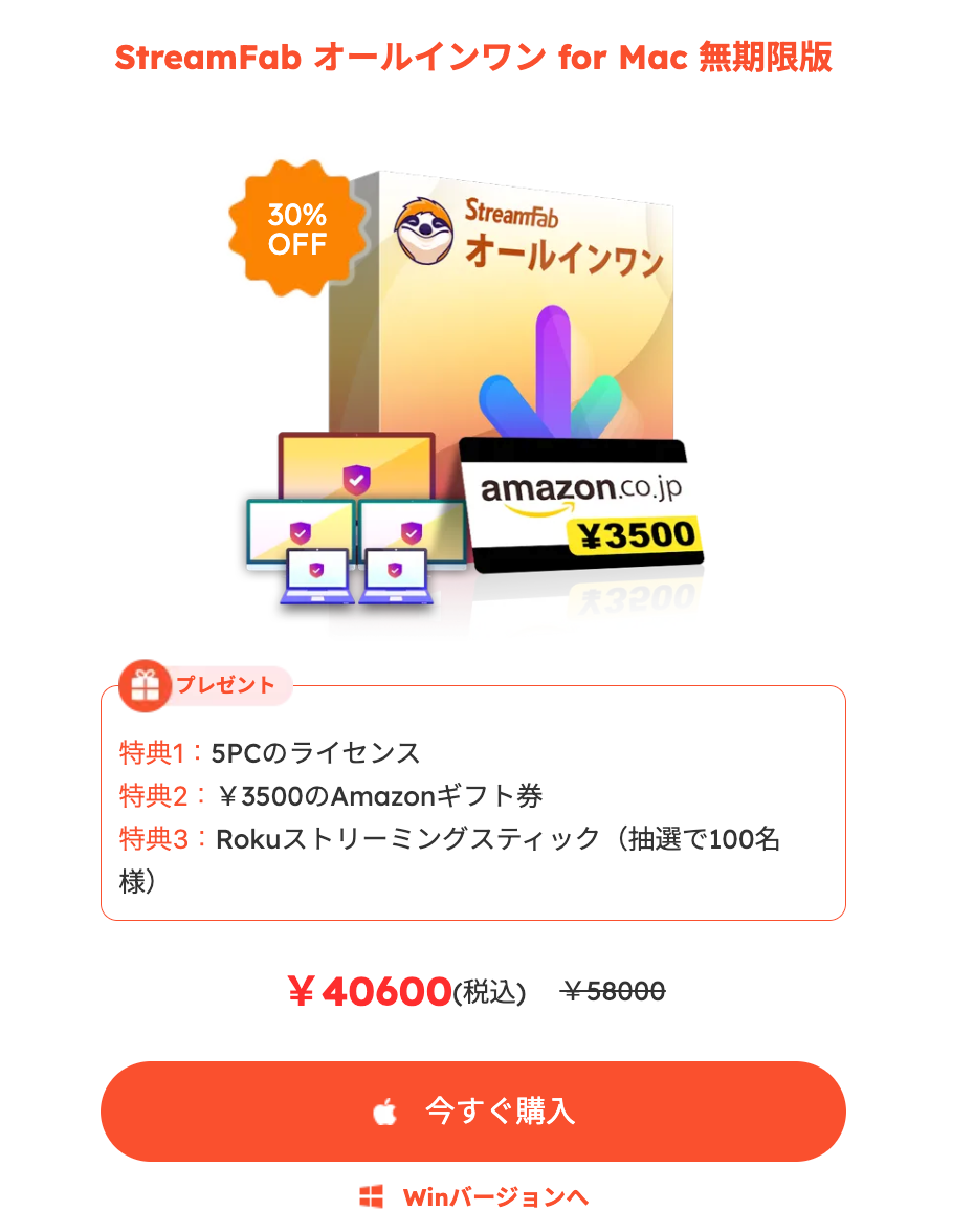 通常58,000円のところ、30%オフの40,600円で提供。5PCライセンス、3,500円分のAmazonギフトカードが付属し、抽選で100名にRokuストリーミングスティックがプレゼントされます。