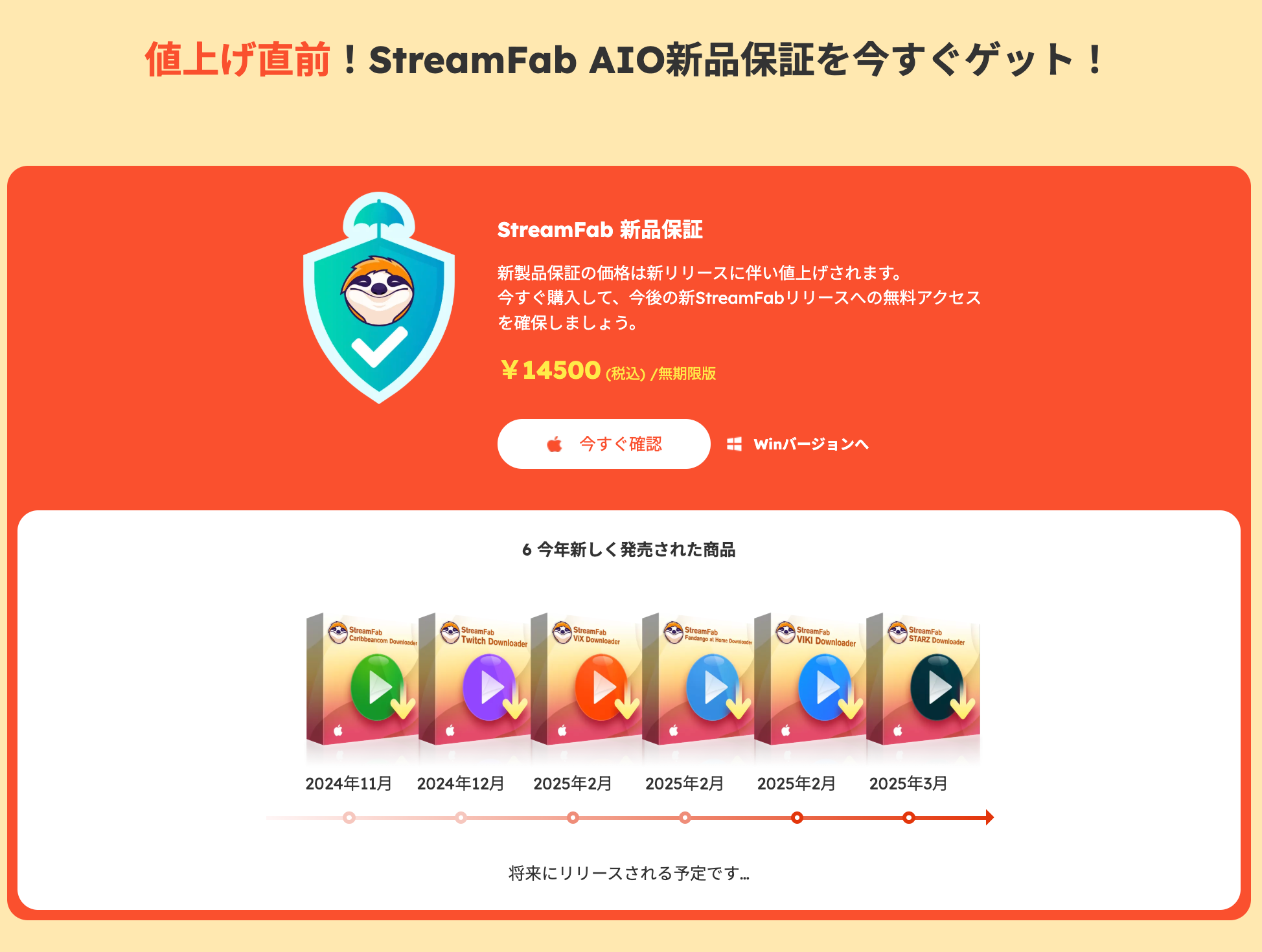14,500円(無期限版)で購入すると、今後のStreamFab新製品に無料でアクセス可能。価格は新製品リリースに伴い上昇予定のため、早期購入がお得です。