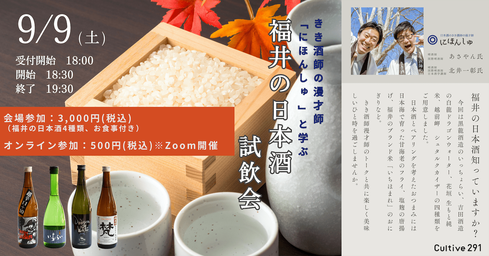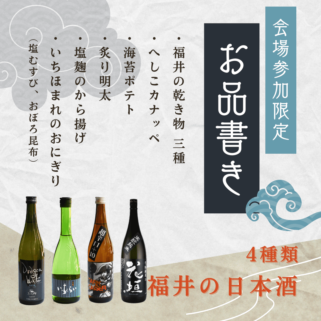 参 加 費:会場参加 3,000円 (福井の日本酒4種類、お食事付き)