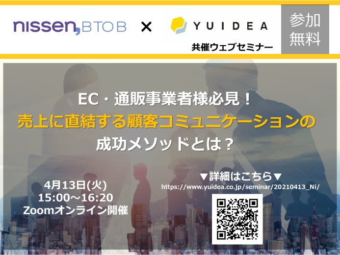 株式会社YUIDEA(本社:東京都文京区 代表取締役社長:宮﨑 美紀)は、株式会社ニッセン(本社:京都府京都市 代表取締役社長 羽渕 淳)と共催で、「EC・通販事業者様必見!売上に直結する顧客コミュニケーションの成功メソッドとは?」と題した無料セミナーを2021年4月13日(火)にオンラインで開催いたします。