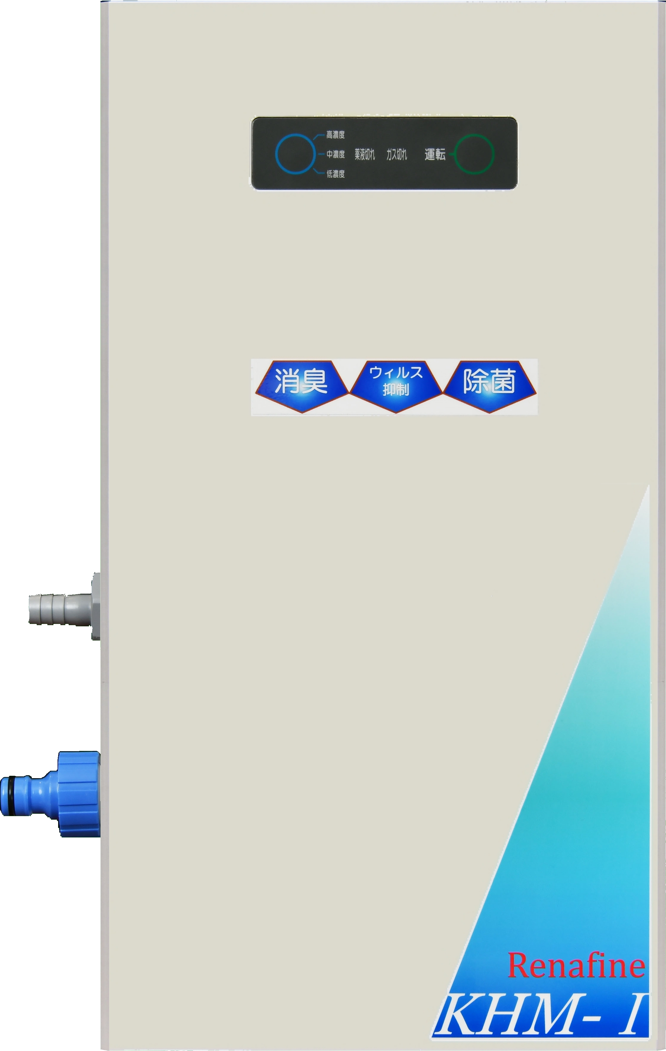 「KHM-1」は1回のセットで毎時360ℓの次亜塩素酸水を生成することができ、幅が約20cmというコンパクトサイズのため、食品工場や保育施設、老人介護施設などにちょうど良い大きさとなっています。